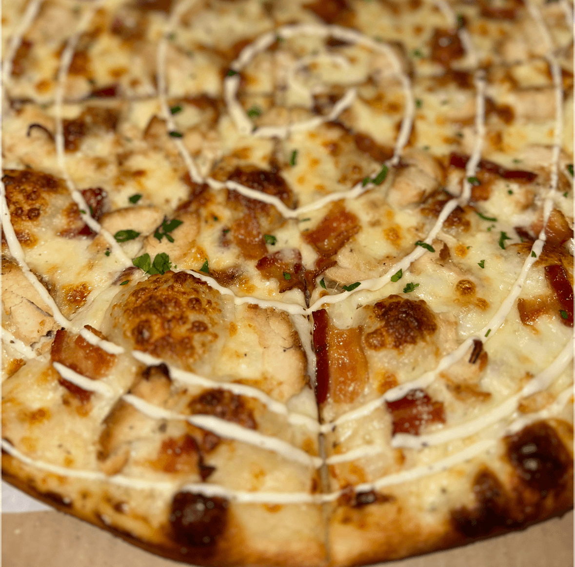 Grilled chicken, bacon, mozzarella, ranch dressing (no red sauce)