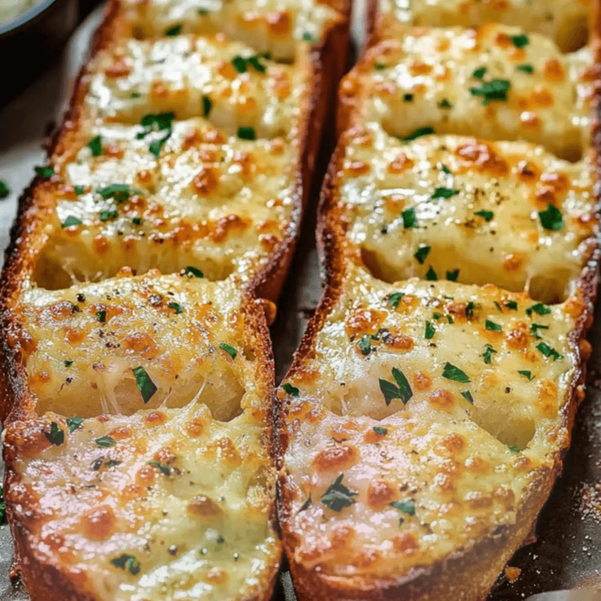 Freshly baked garlic bread, brushed with garlic butter and topped with melted mozzarella cheese.