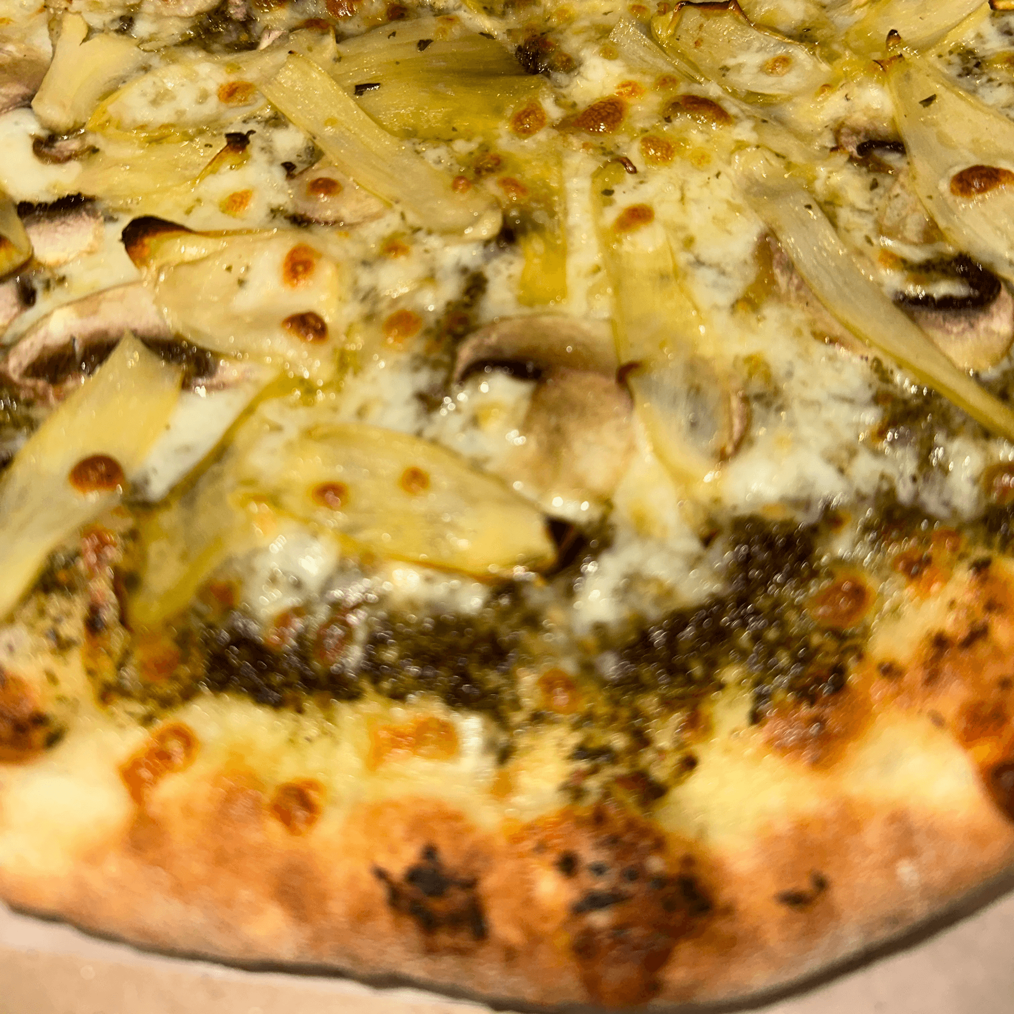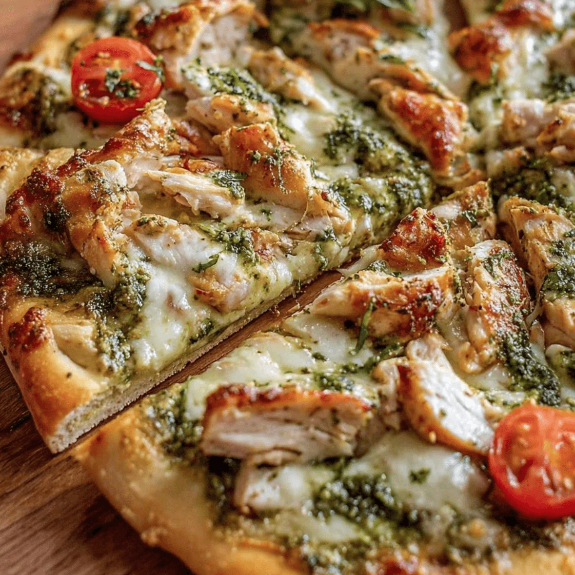 Crushed Italian tomatoes, pesto, mozzarella & Pecorino Romano, chicken, cherry tomatoes.