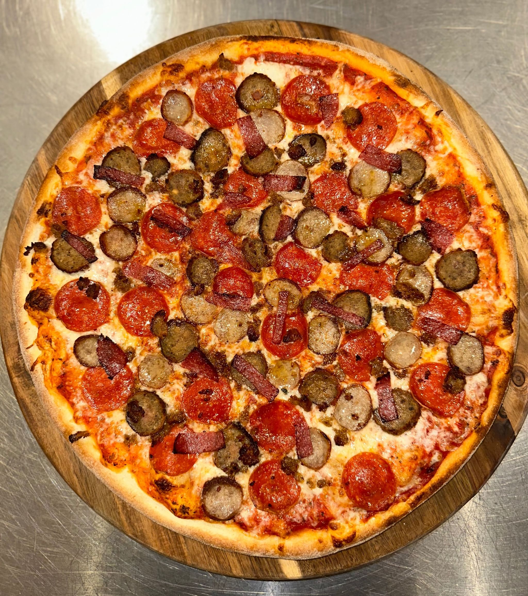 Tomato sauce, mozzarella, pepperoni, sausage, ham, meatballs