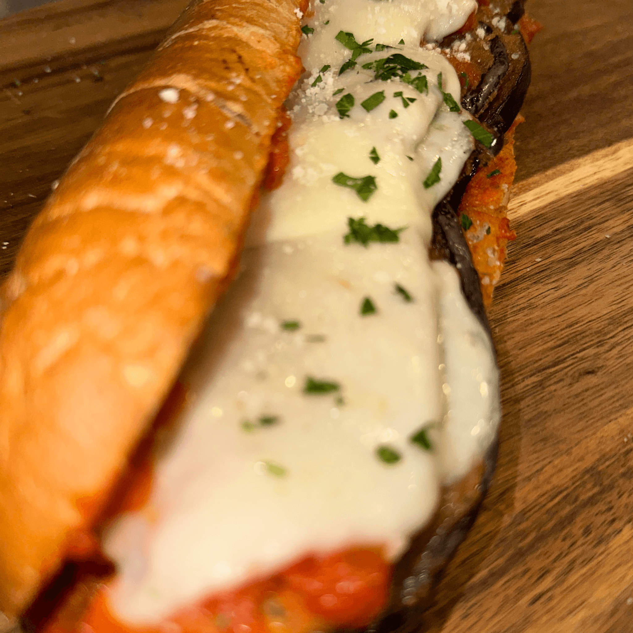12-inch sub. Homemade breaded eggplant topped with our classic tomato sauce, melted provolone, and Romano cheese,
