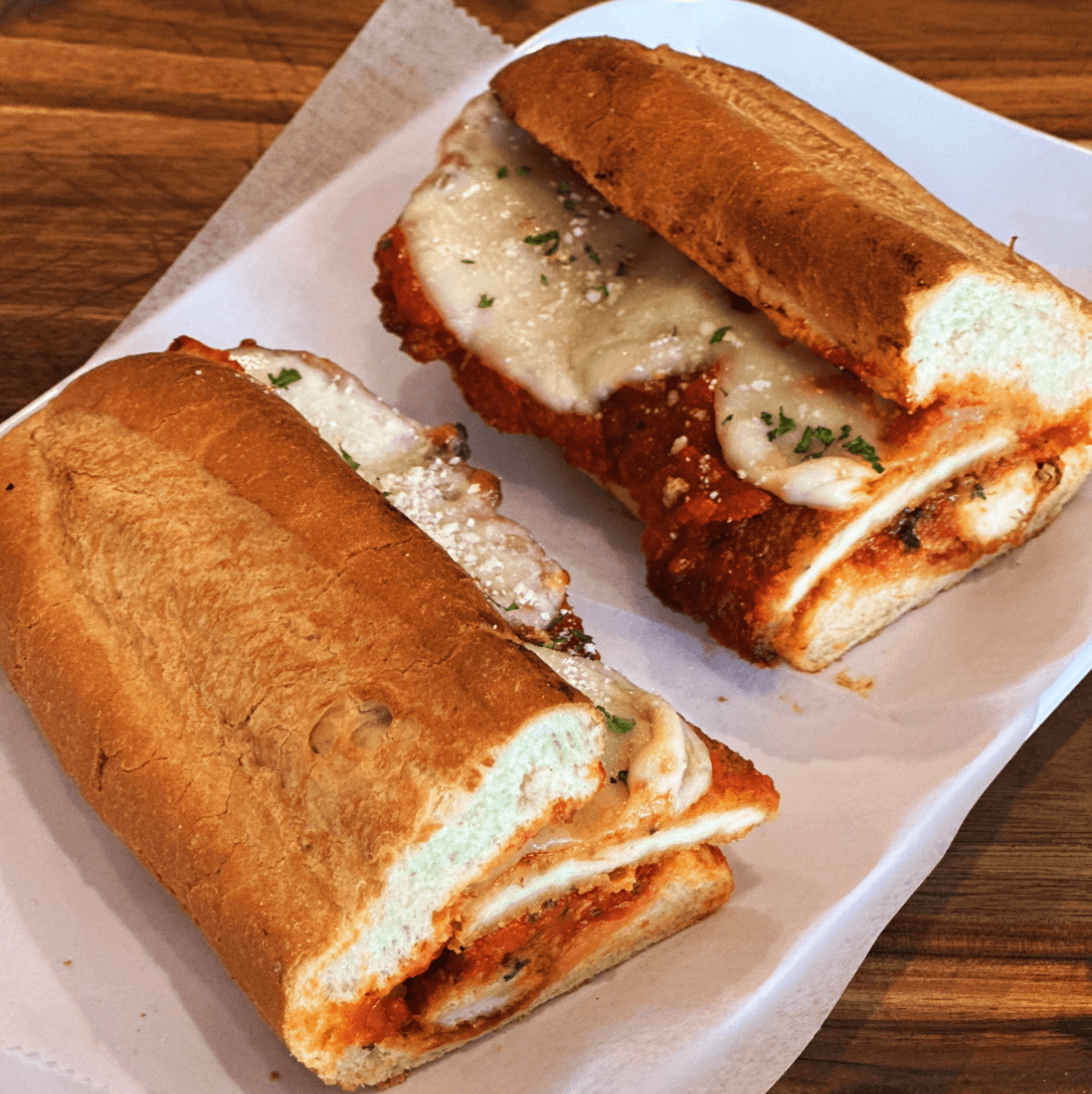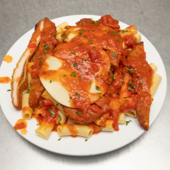 Homemade breaded chicken cutlet with tomato sauce, provolone & Romano cheese.