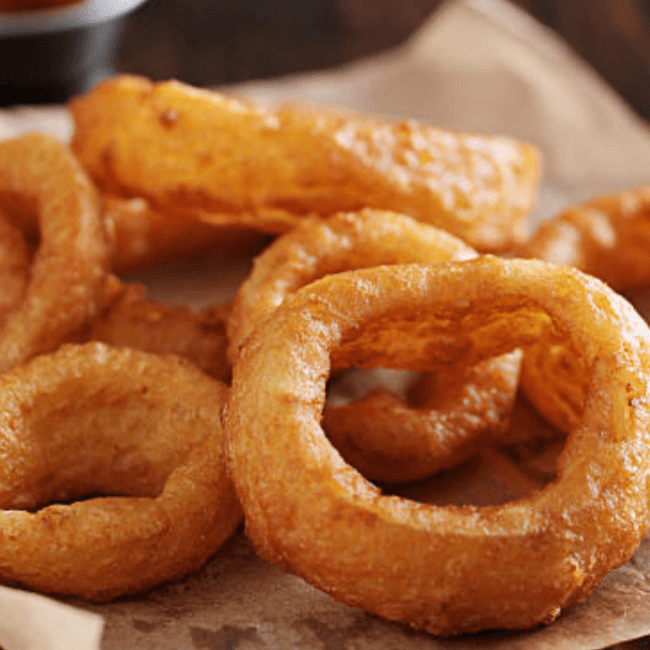 Crispy battered white onion rings, golden and delicious