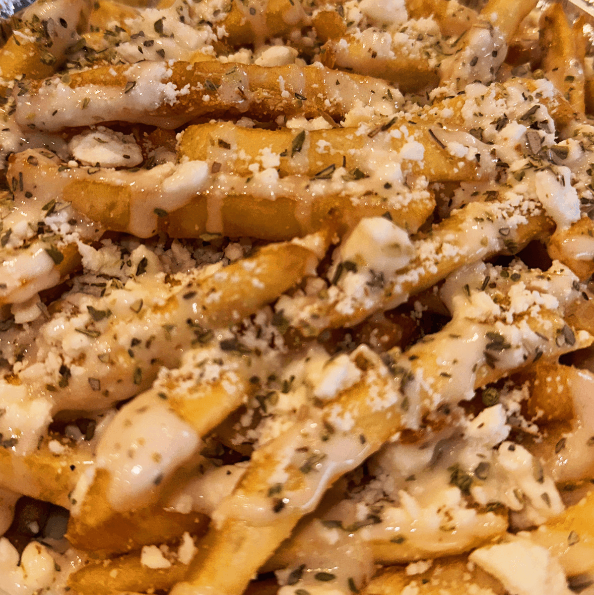 Fries, Greek dressing, feta cheese, olive oil, oregano.