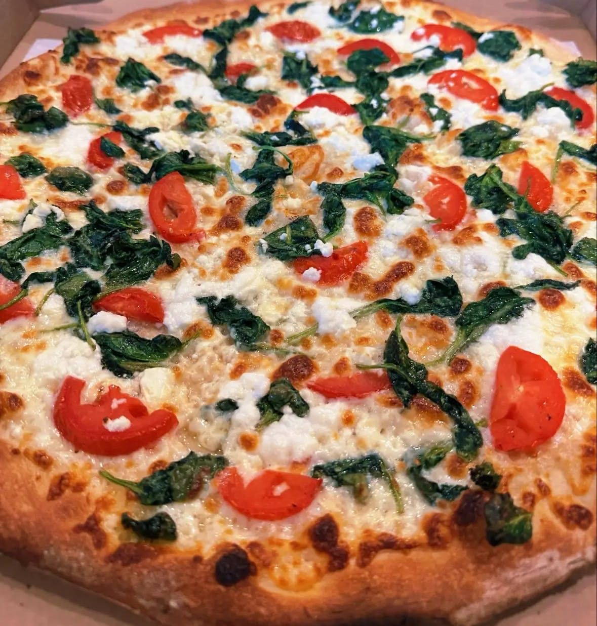Crushed Italian tomatoes, olive oil, mozzarella & Pecorino Romano, spinach, feta, tomatoes, Kalamata olives.