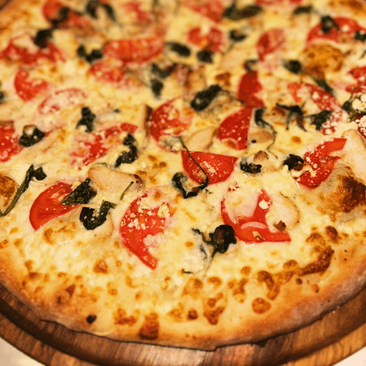 Mozzarella, spinach, feta, tomatoes, black olives, grilled chicken