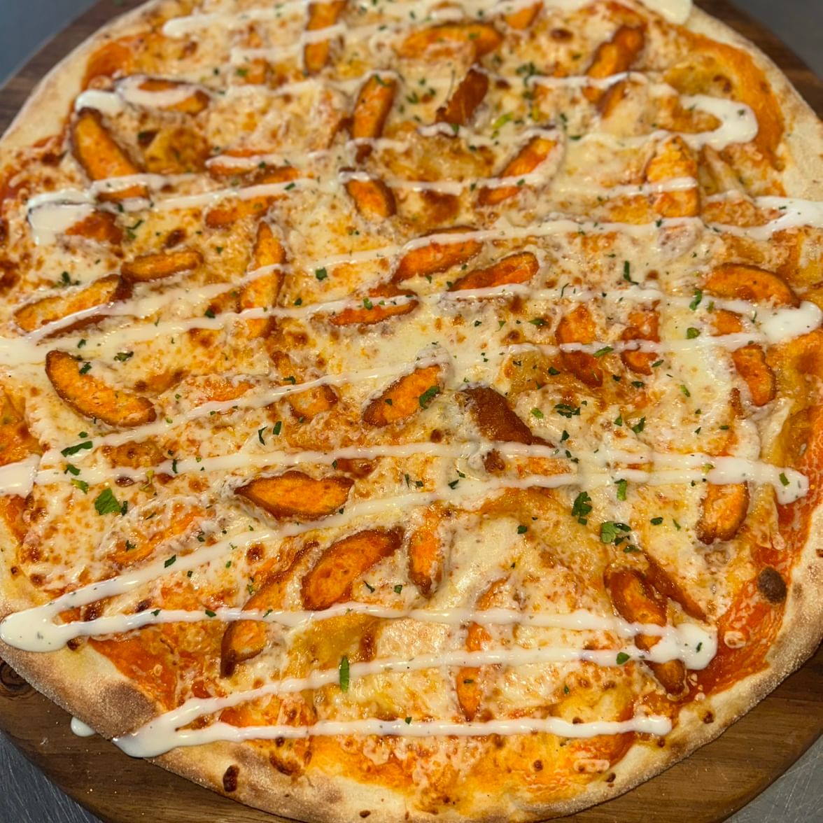 Crunchy fried chicken tossed in BBQ sauce, caramelized onion, mozzarella