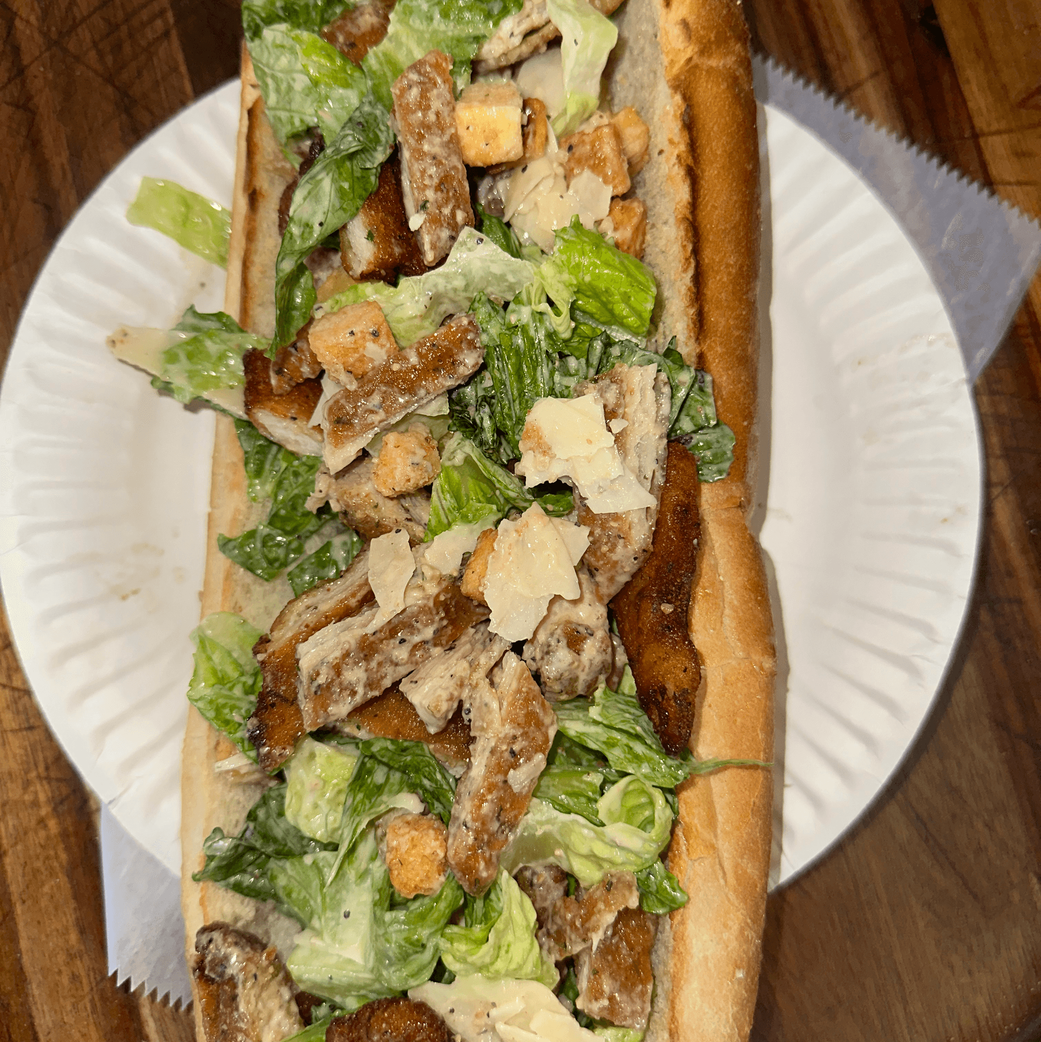 Hand-breaded CRISPY chicken tenders mixed in our Caesar salad on a toasted sub roll.